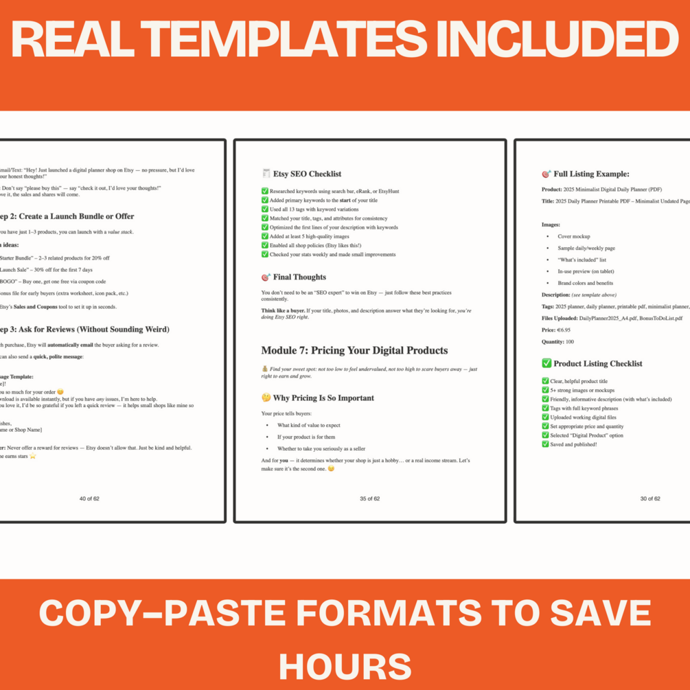 This 61-page digital PDF course is your complete Etsy seller kit โ packed with checklists, templates, SEO tools, and a faceless marketing content planner.